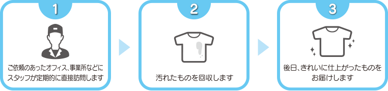 ●直接オフィス、事業所まで訪問させていただきますので、クリーニング店に持ち込む煩わしさがなくなります。