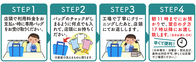 ※水洗い不可の素材(スーツ・ウール類・シルクなどの高級素材・帽子・合成皮革)など、その他当店が洗濯不可と判断した物はお預かりできません。